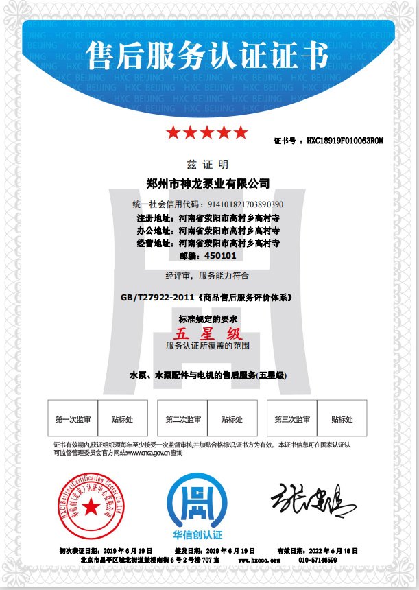 祝賀鄭州市神龍泵業(yè)有限公司獲得水泵、水泵配件與電機的五星級售后服務認證。