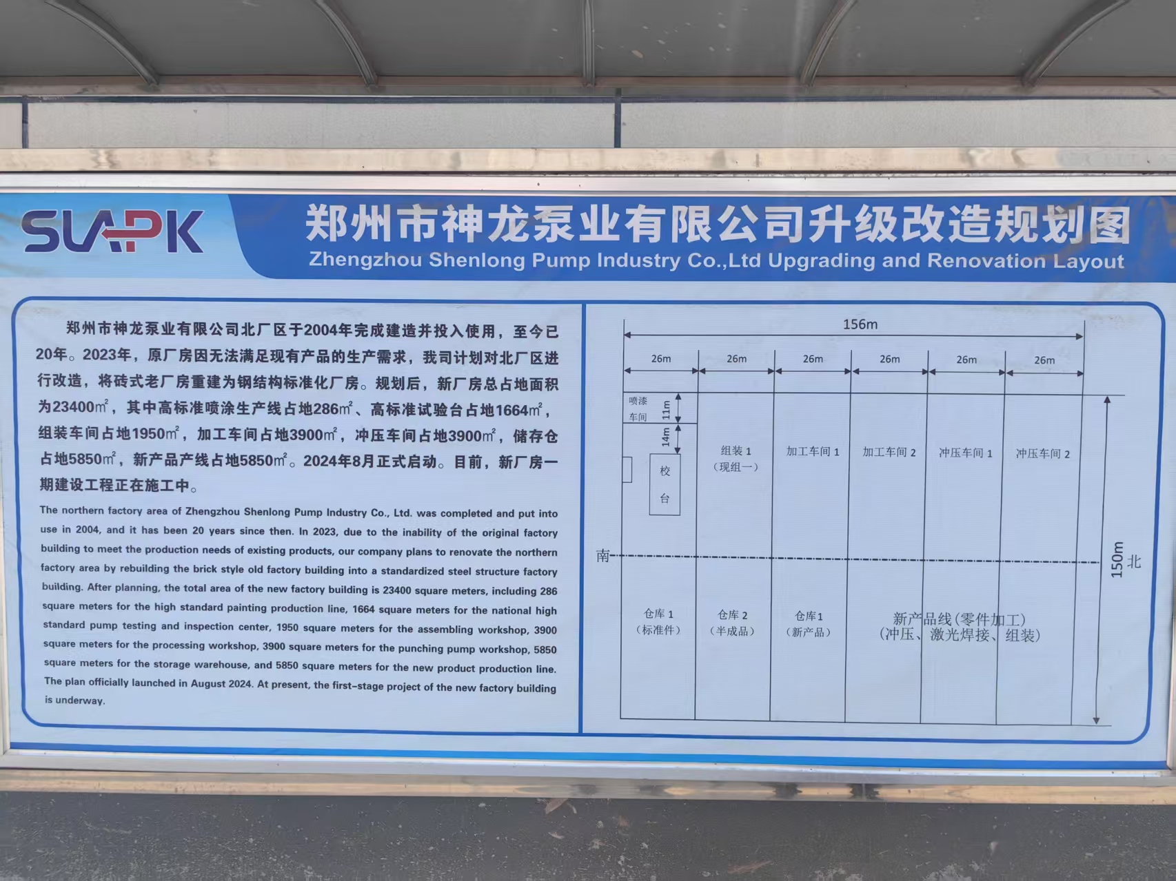 鄭州市神龍泵業(yè)有限公司北廠區(qū)于2004年完成建造并投入使用,至今已20年。2023年,原廠房因無法滿足現(xiàn)有產(chǎn)品的生產(chǎn)需求,我司計劃對北廠區(qū)進行改造,將磚式老廠房重建為鋼結(jié)構(gòu)標準化廠房。規(guī)劃后,新廠房總占地面積為23400㎡,其中高標準噴涂生產(chǎn)線占地286㎡、高標準試驗臺占地1664㎡組裝車間占地1950㎡,加工車間占地3900㎡,沖壓車間占地3900㎡,儲存?zhèn)}占地5850㎡,新產(chǎn)品產(chǎn)線占地5850㎡。2024年8月正式啟動。目前,新廠房一期建設工程正在施工中。